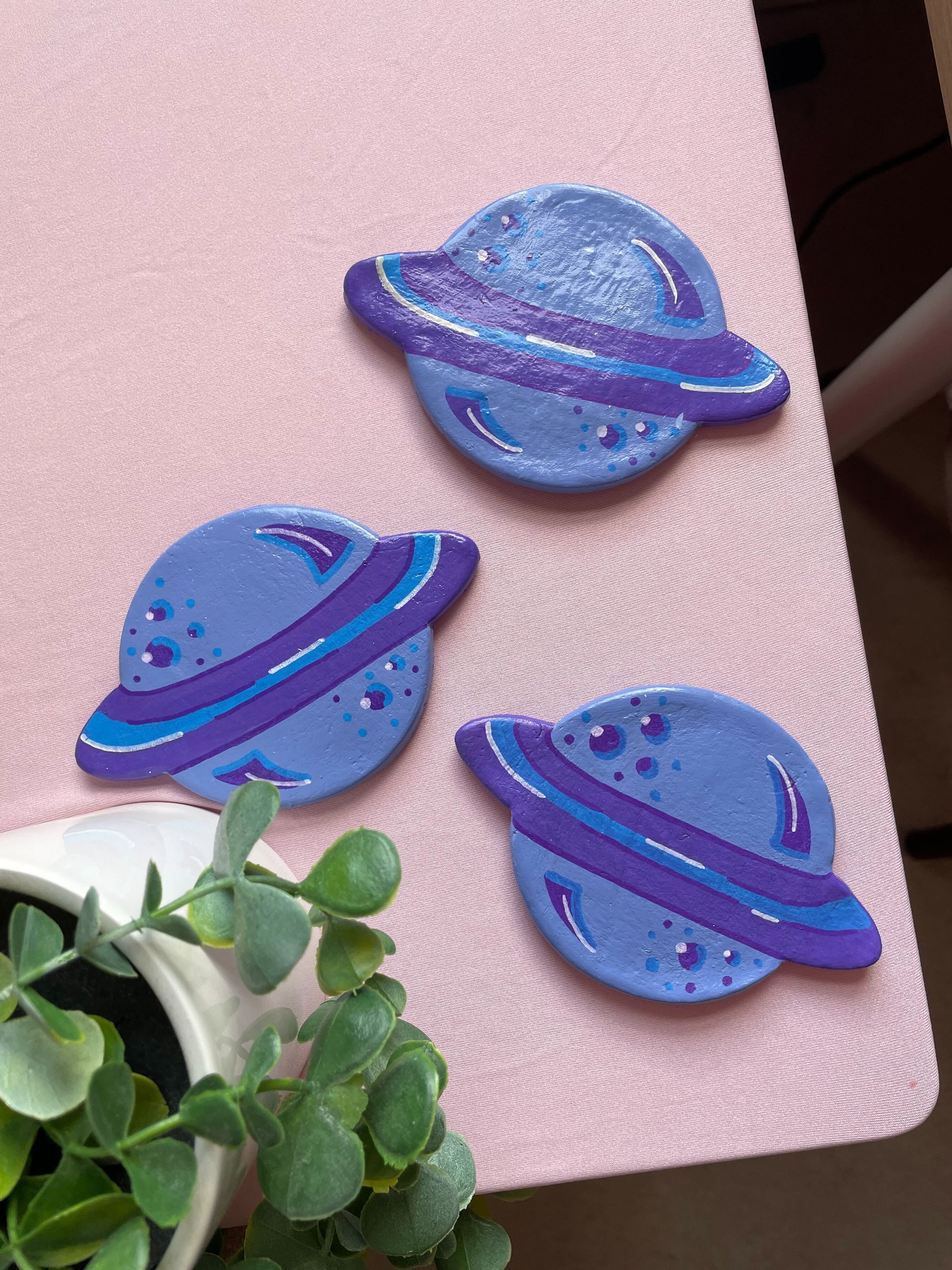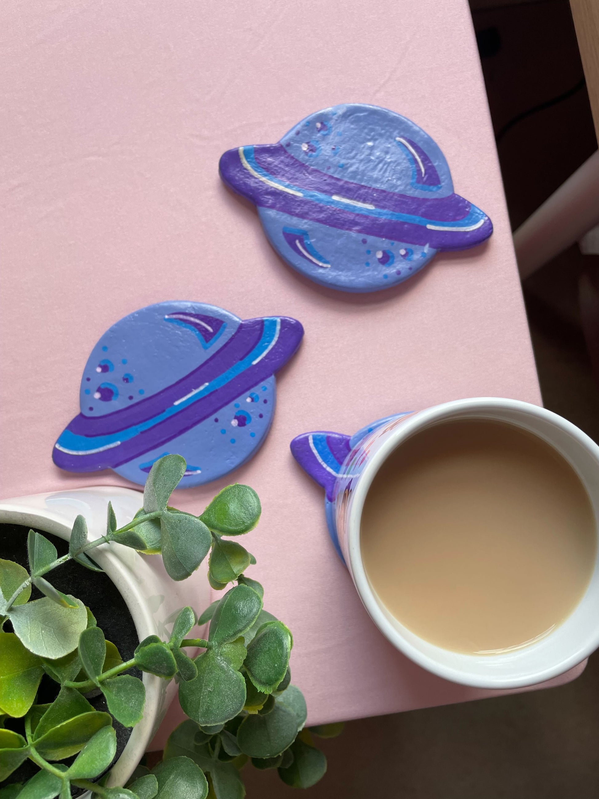 Let's go intergalactic! Brighten up any desk or coffee table with this handmade blue planet clay coaster.