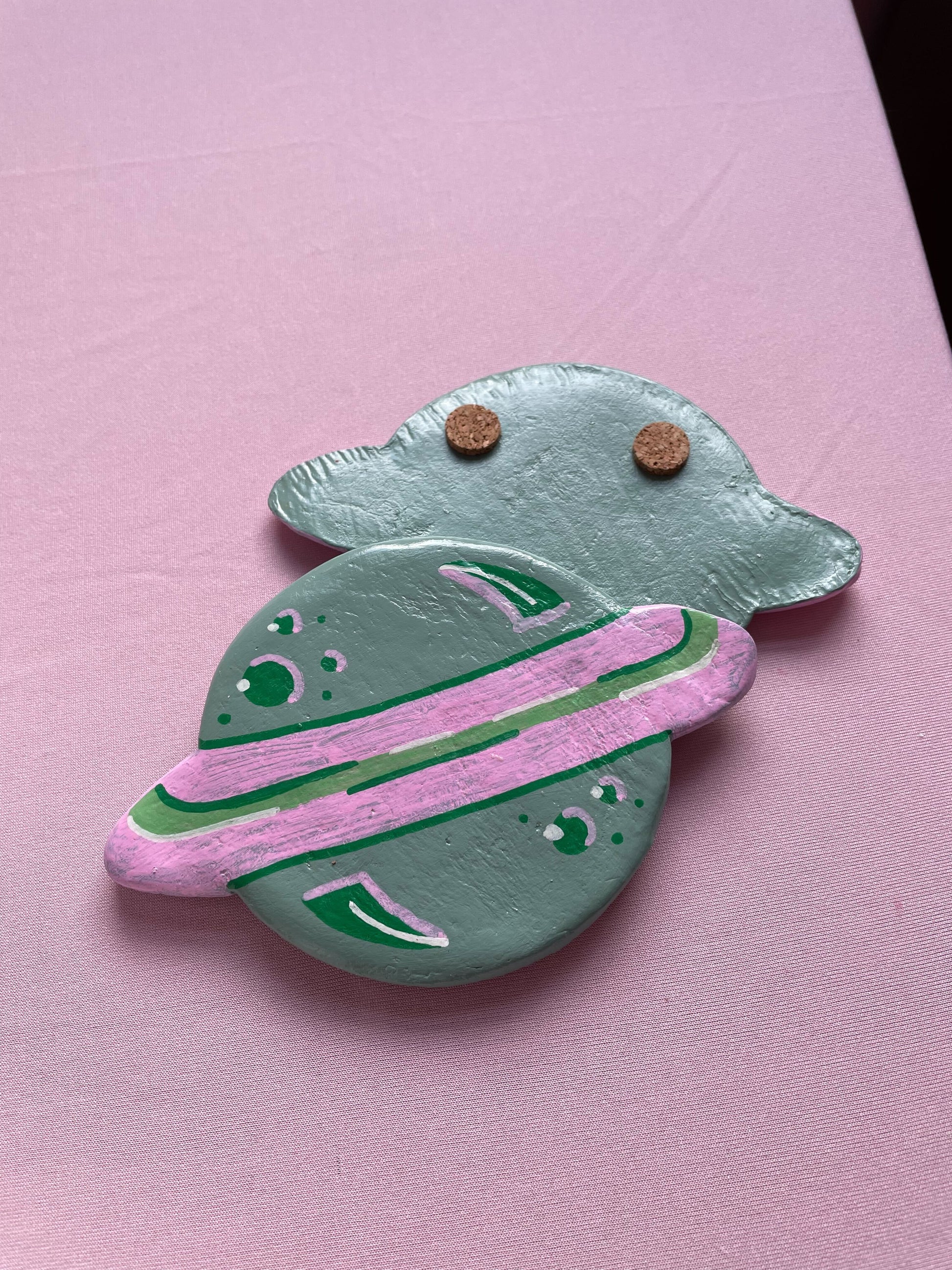 Let's go intergalactic! Brighten up any desk or coffee table with this handmade green planet clay coaster.